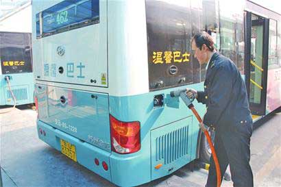 场站工作人员正在为温馨巴士公交车充电 近日,新型海格纯电动公交车在交运温馨巴士461路上一亮相便吸引了不少乘客的围观。记者了