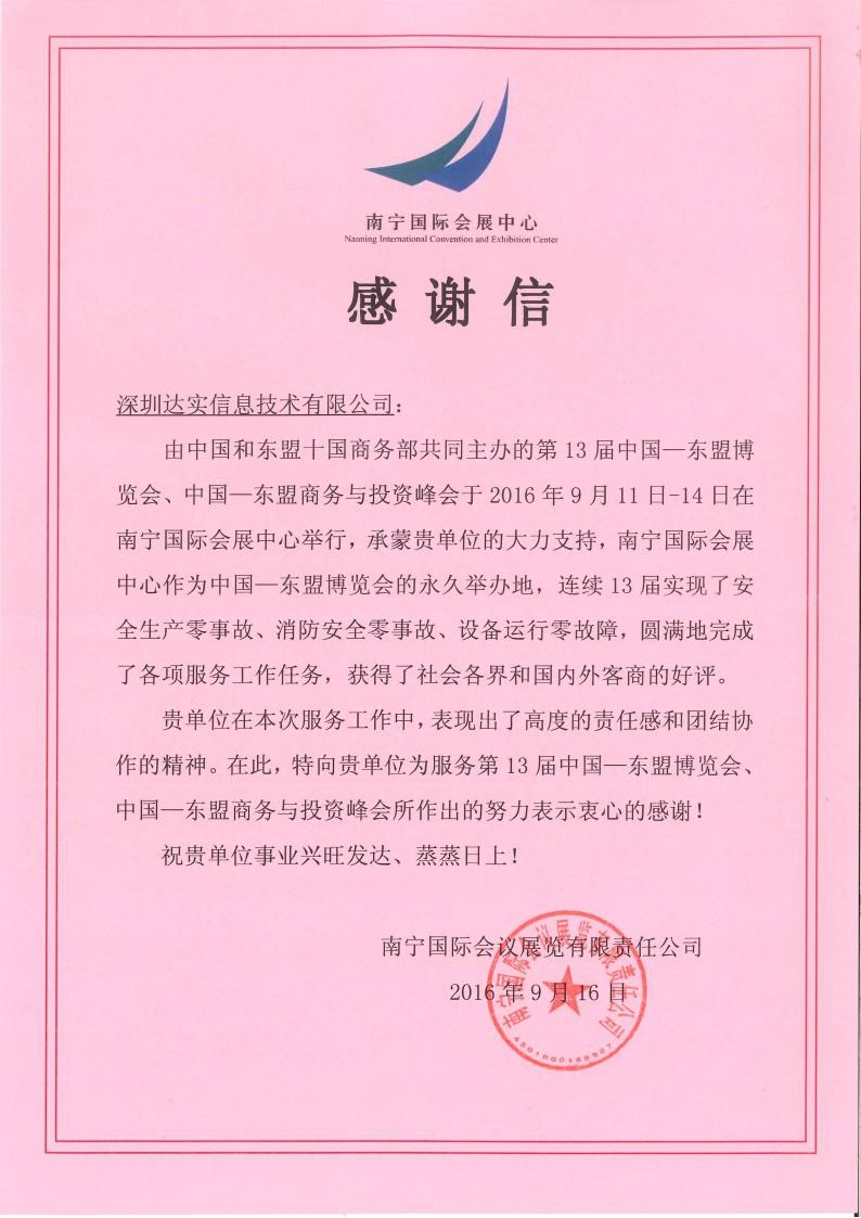 近日,南宁国际会议展览有限责任公司向达实发出感谢信,针对达实在东盟博览会、东盟商务与投资峰会上所提供的梯控,通道闸,储物柜产品实