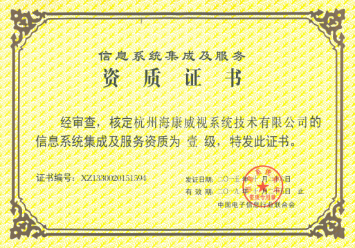 海康威视系统公司获得计算机信息系统集成一级资质
