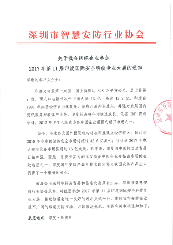 关于我会组织企业参加2017年第11届印度国际安全科技专业大展的通知