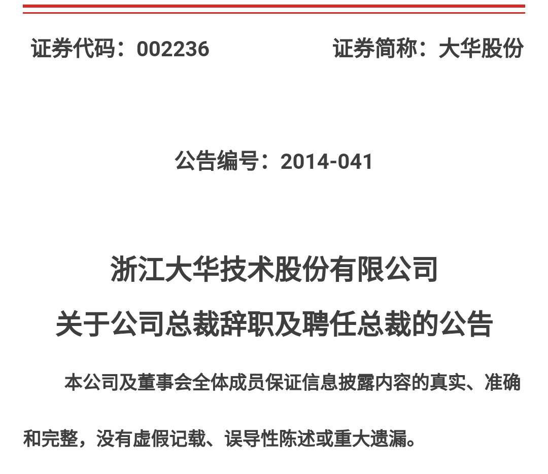 大华股份总裁傅利泉辞职,前华为高管接任 大华股份5月3日晚间公告,公司董事会收到总裁傅利泉先生的书面辞职报告,傅利泉先生因个人