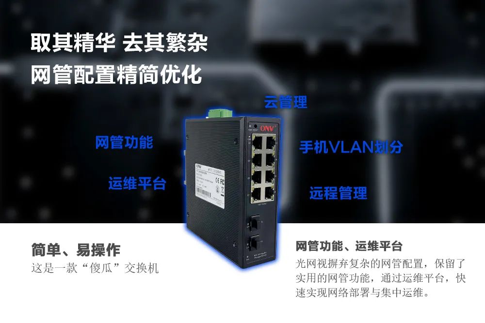 极简配置网管工业交换机傻瓜型交换机简单便捷,网管交换机网管配置丰富,极简网管工业交换机是ONV摒弃了复杂的网管配置,保留实用的