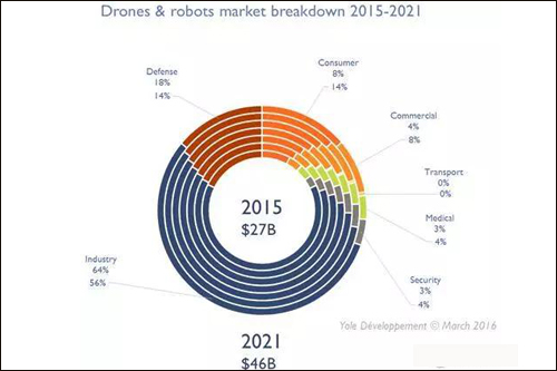 应用于无人机和机器人的传感器市场强劲增长,2015年达到3.51亿美元,预计2021年将达到7.09亿美元,2015~202