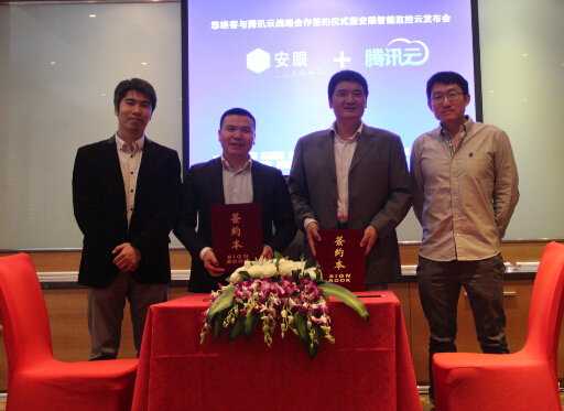 4月16日下午,悠络客&腾讯云战略合作签约仪式暨国内首家永久免费视频监控-安眼云平台发布会在深圳金茂万豪酒店隆重举行