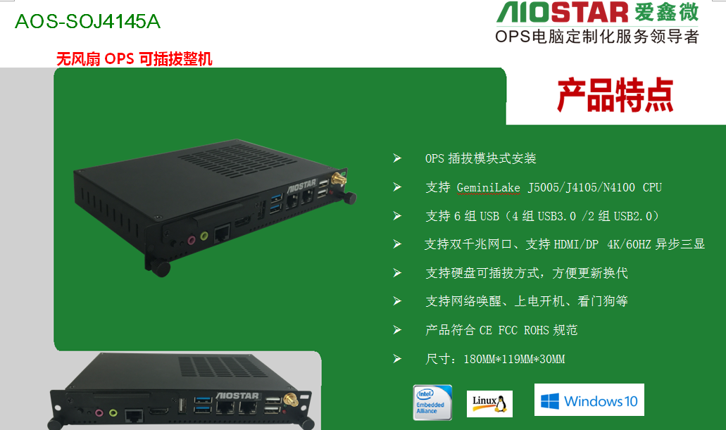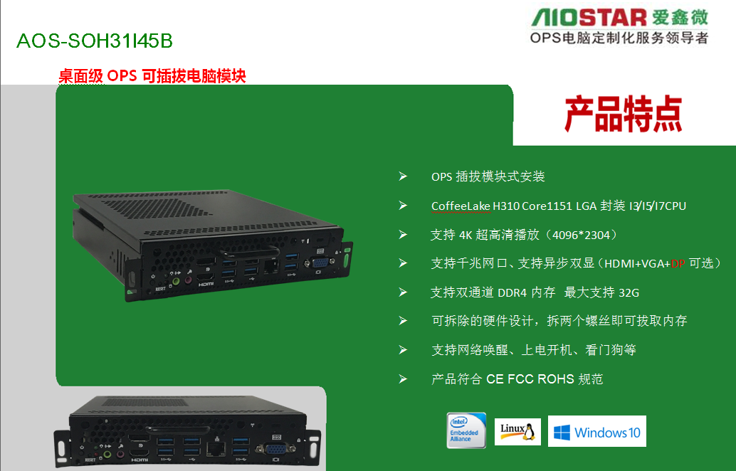 爱鑫微电子(AIOSTAR)是国内OPS电脑产品线最全的研发、生产、销售为一体的厂家,同时提供OEM/ODM定制服务,目前主产品线为: