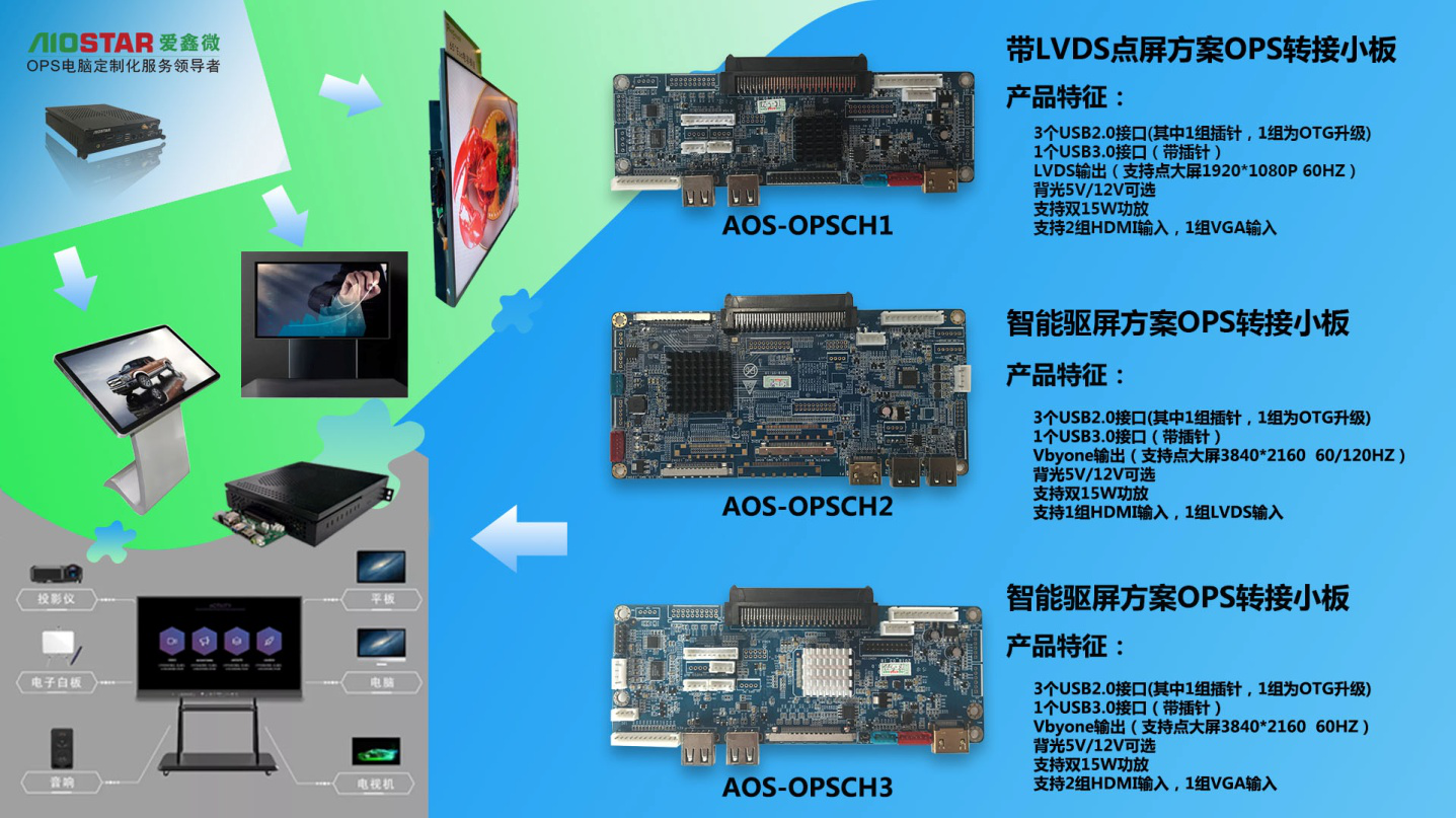 OPS转接小板:支持3USB+HDMI/支持6USB+HDMI/支持5USB+HDMI+RJ45网口/支持支持5USB+HDMI+VGA+RJ45网口/支持LVDS点屏/支持Vbyone点屏