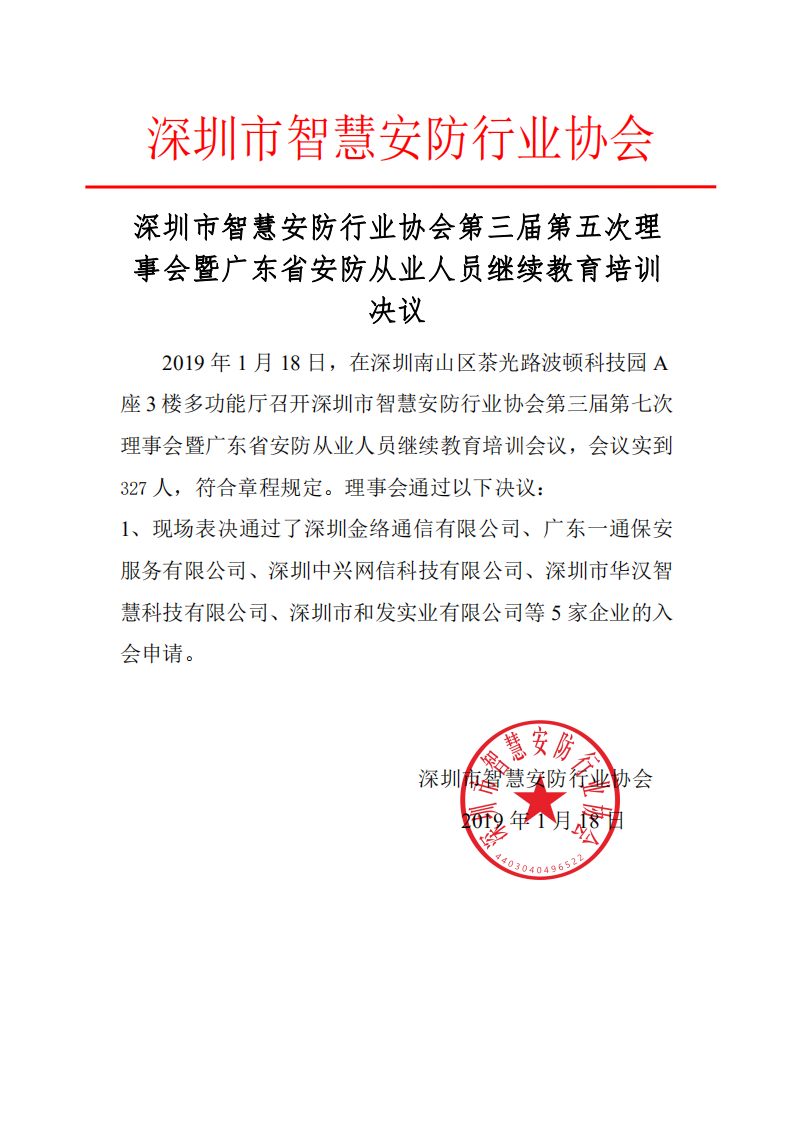 深圳市智慧安防行业协会第三届第五次理事会暨广东省安防从业人员继续教育培训决议
