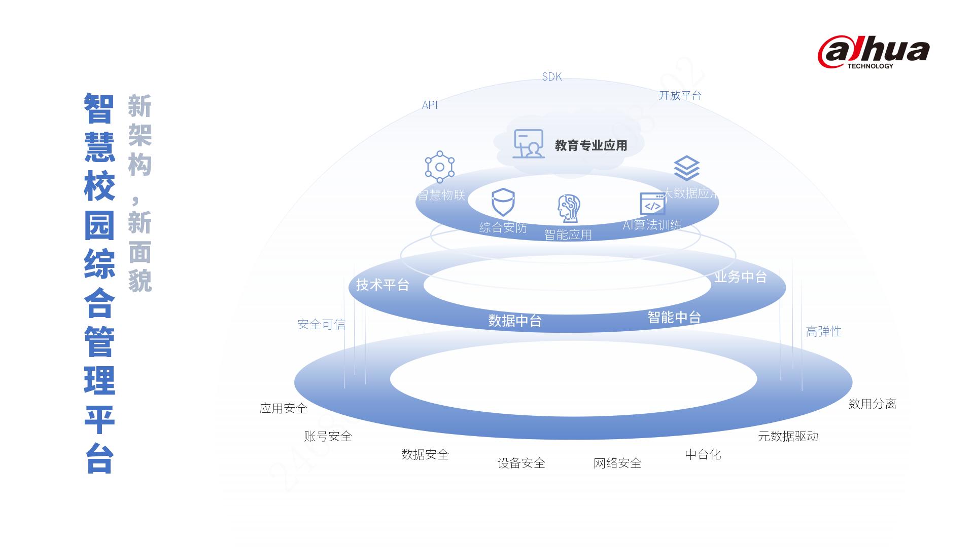 在现实问题的敦促和国家政策的引领下,大华股份持续钻研教育行业发展,深入研究教育信息化管理,在2021年重磅推出“大华浩睿·智慧校园综合管理平台”。智慧校园综合管理平台,采用新一代架构,融合多种技术服务、安全技术,保障平台高弹性、高安全;基于技术平台、数据中台、智能中台、业务中台,覆盖基础物联、智能应用、AI算法训练、大数据应用开放平台等核心领域,融合扩展校园管理应用,并通过API、SDK、开放平台的途径,帮助校园完成信息化建设。
