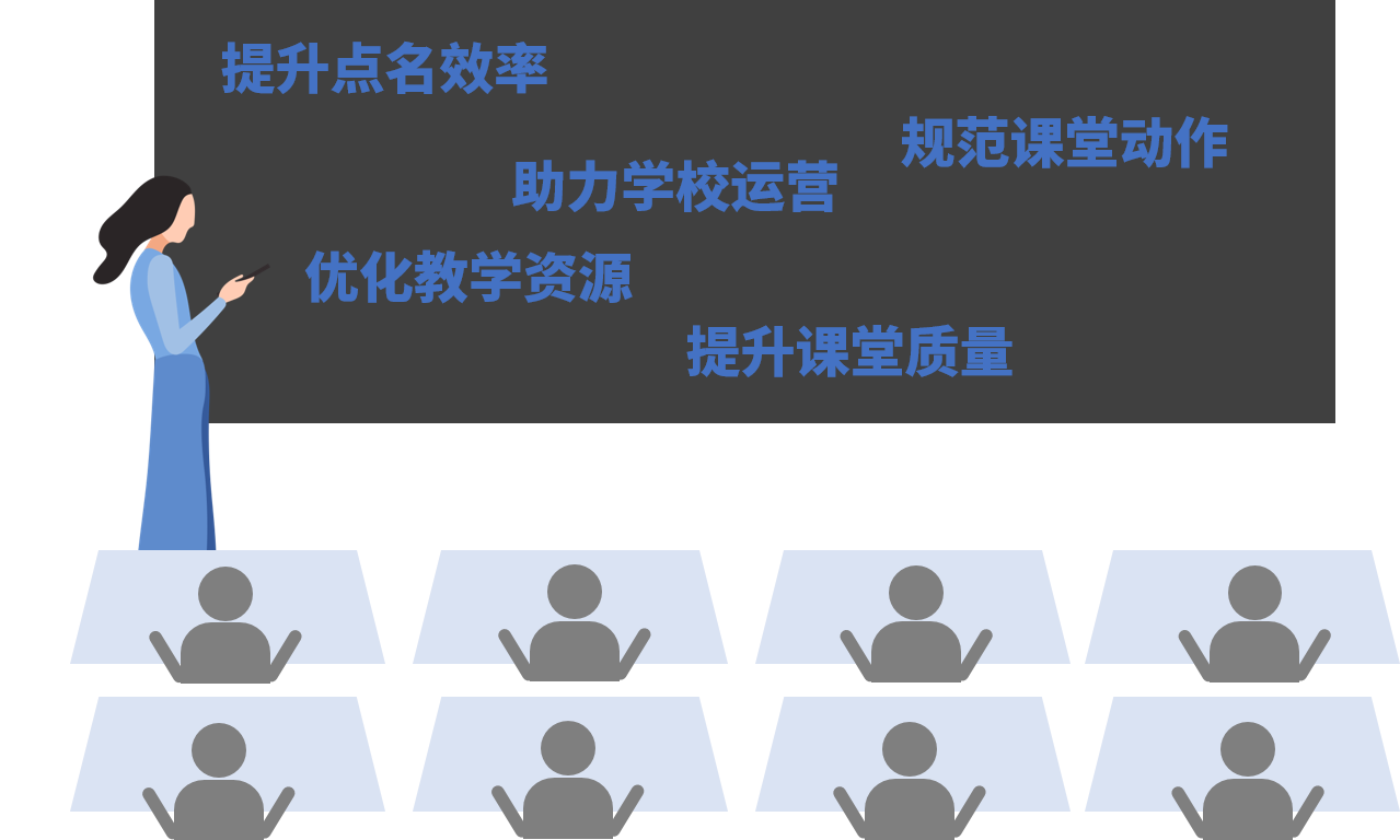常规课堂教学,老师课前点名,出现代签到的情况,到课情况难以管控;不同老师教学水平参差不齐,教学过程好于坏也无法直接量化评价;每个学生课堂表现差异大,教师课堂纪律约束能力、教学效果好坏难以直观反馈;教学资源有限,教师资源利用率低。