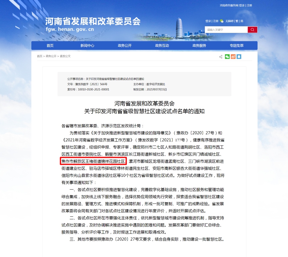 近日,据河南省发展和改革委员会消息,为健康有序推进河南省智慧社区建设,河南正式印发河南省省级智慧社区建设试点名单的通知,确定10个社区为河南省级智慧社区试点,其中包括由力维智联与焦作联通联合建设的“焦作市解放区王褚街道锦祥花园社区项目”。