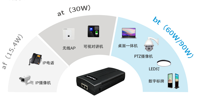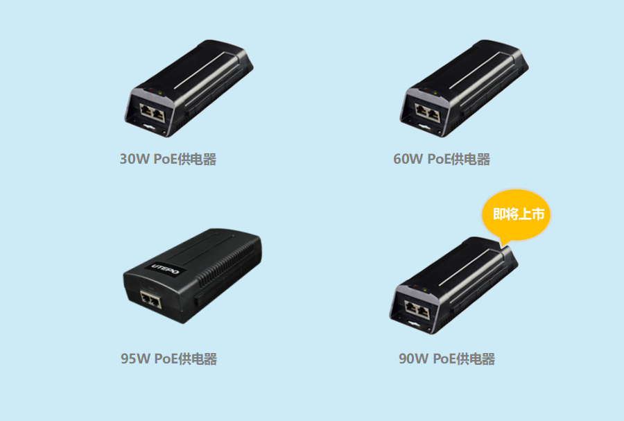 为满足不同终端设备的供电需求,优特普公司除了提供30W标准PoE供电器,还研发设计了60W、90W、95W bt PoE大功率供电器产品,为IP电话、智能球机、云台摄像机、11ac无线AP、Led灯、数字标牌等提供供电和数据传输支持。