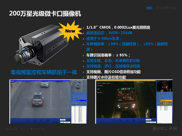 作为领先的智能视频监控解决方案及产品供应商,景阳科技200万星光级微卡口摄像机可以达到这样的准确率,在夜间不需要补光的情况下可以做到95%以上,白天可做到98%以上。200万可以监看3车道。支持车牌、车型、车身颜色的识别,支持超速、逆行、压线等违法的检测。有人认为其作为卡口电警等抓拍单元的补充应用,用于抓拍卡口和电警覆盖不到的路面。