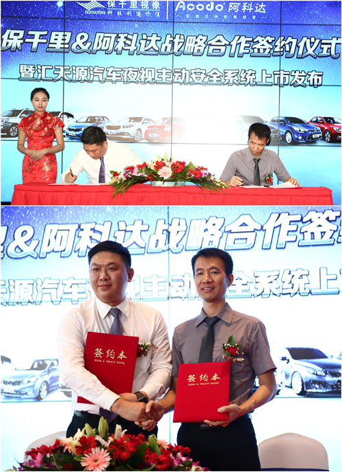 8月19日,保千里&阿科达战略合作签约仪式暨汇天源汽车夜视主动安全系统上市发布会于深圳市东风悦达起亚香蜜湖4S店举行,保千里视像科技集团总裁鹿鹏、汇天源汽车集团董事长李炳华、保千里视像科技集团常务副总裁蒋建平、汇天源汽车集团董事长助理蒙文斌、阿科达汽车电子有限公司总经理温寒、汇天源汽车集团特邀嘉宾陈国章、平安银行深圳福田支行行长项国庆、陕西中起汽车集团董事长张兴社等领导出席大会,十数家媒体现场助阵。