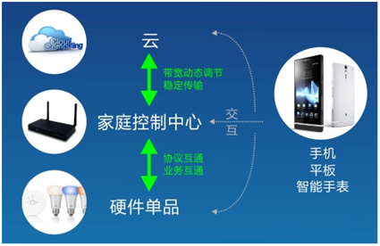 其次,在家庭内部,要高效实现家庭控制网关与终端硬件的互联互通。家庭控制网关是家庭互联的中心,它与终端硬件的互联互通涉及两个层面:其一,网络互连,实现家庭内ZigBee、Zwave、WiFi等多协议间的连接与调用。其二,业务互通,比如当摄像头碰到了屏幕,将会衍生视频通话、在线教育等丰富应用;此外,很多摄像头不具备加密、防毒等能力,连接到因特网后容易被黑客监控,如果这些摄像头调用了安全厂家的能力,既可以解决安全问题,又减少了研发、维护的投入。