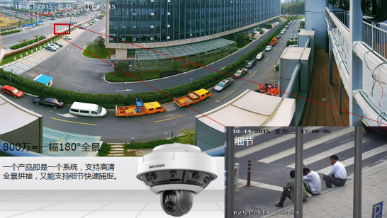全景端每4个摄像头负责1个全景180度的监控画面(可提供1个或2个全景180度画面),达到全景监控效果。下方球机负责联动定位和跟踪功能,提供23倍光学变焦、16倍数字变焦,只需要点击全景画面的任意一个点,都可以实现快速的变倍并捕捉到远处的目标。