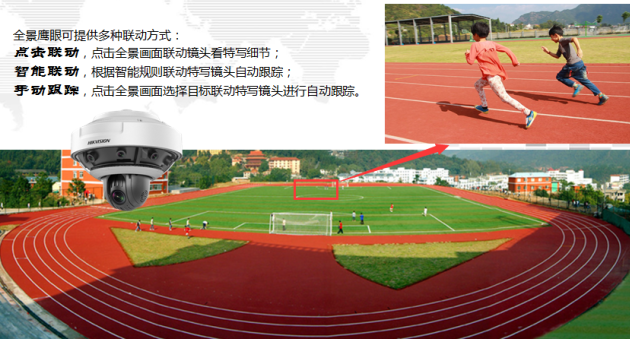 与此同时,产品还可提供多种联动方式:点击联动,点击全景画面联动镜头看特写细节;智能联动,根据智能规则联动特写镜头自动跟踪;手动跟踪,点击全景画面选择目标联动特写镜头进行自动跟踪。