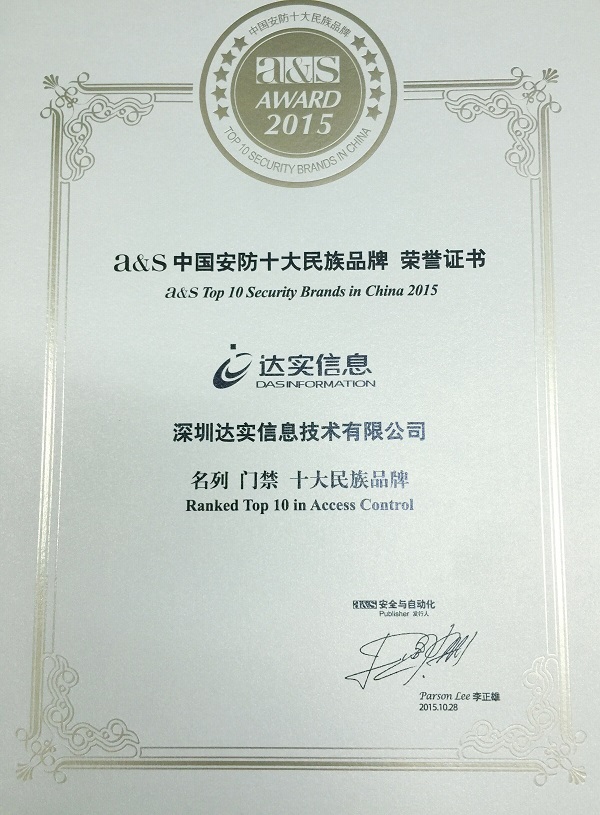 近日,第12届“a&s中国安防十大品牌颁奖暨2015安防发展高峰论坛”在深圳马哥孛罗好日子酒店隆重举行。深圳达实信息技术有限公司(以下简称“达实信息”)自主研发系统“C3门禁一卡通”凭借其设计精密、性能安全等突出优势,在众多参评门禁品牌中脱颖而出,荣获门禁类“a&s中国安防十大民族品牌”。