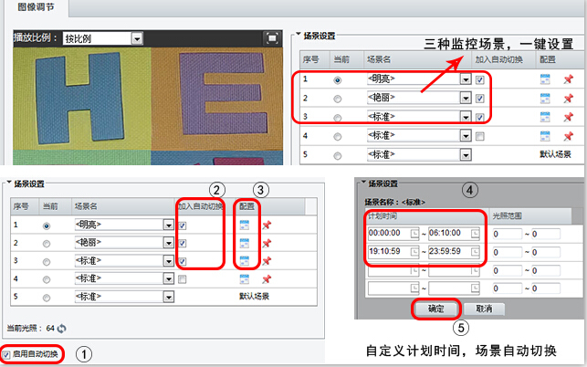 用户也可根据不同时间段,环境中光线强度及眼睛的疲劳程度不同,让监控画面风格自动切换。用户启动自动切换功能,勾选需要加入自动切换的场景,设置每种场景的时间计划,摄像机将根据计划自动切换场景模式。