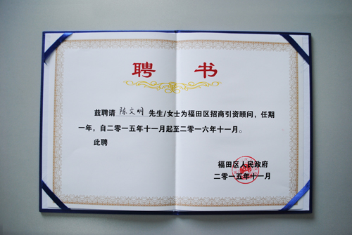 众所周知,福田区是深圳中心城区,是深圳市政府所在地。福田区地均GDP是全市平均水平的5倍;社会消费品零售总额居全市各区之首;金融业占全市半壁江山;人均GDP在2013年已超越韩国;第三产业增加值占GDP的九成以上,已达到世界先进水平……近年来,深圳市福田区依托连通全球、衔接港澳、辐射华南纵深腹地的独特区位优势,在总部经济、金融、文化等产业领域,取得了丰硕的成果。陈文明董事长被诚聘为招商引资顾问,是深圳市福田区对中瀛鑫及陈文明董事长为福田区的发展所做出贡献的肯定,也将激励企业继续努力,为深圳市、为社会贡献更大的力量。