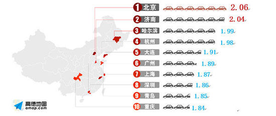 同时,报告还公布了2015年度中国堵城排行榜,其中,2015年度中国十大堵城依次为:北京、济南、哈尔滨、杭州、大连、广州、上海、深圳、青岛、重庆。北京去年虽然3次实行单双号限行政策(全国最多),但依然毫无悬念稳居榜首。