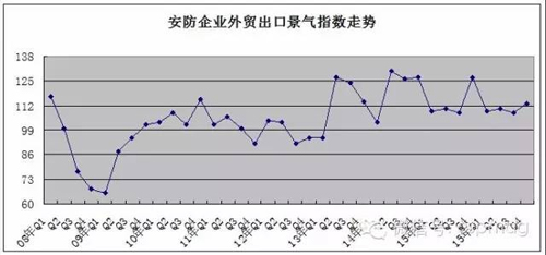 2014年,我国安防行业外贸业务出现了较好的发展势头,景气指数均保持在了“较景气区间”,四季度景气指数达到了127的历史较高水平。2015年一季度外贸出口业务开始反弹下行,外贸出口景气指数骤降为109;二季度继续保持在这一水平,为110;三季度外贸出口景气指数为108,降至“微景气”区间;四季度上升为113,回归至“相对景气区间”,但与上年同期相比下降了14点(见图4)。
