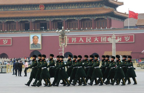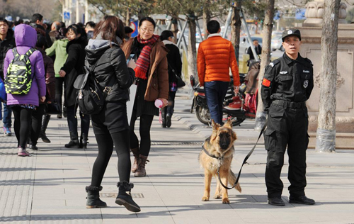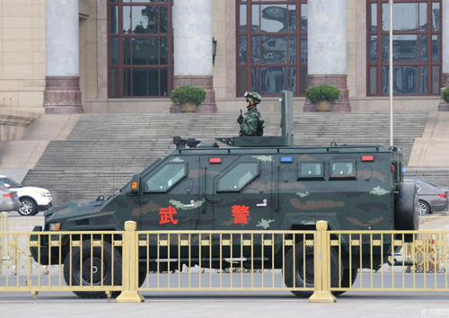 与此同时,天安门及周边区域加强戒备,武警武装巡逻,部署有装甲车。武警北京总队官兵日前进驻两会代表团入住的首都大酒店,执行安保任务;数百名武警在地铁站内进行巡逻。北京城管在两会期间,将全部取消休假,全天候监控会场、人员驻地、行车路线等。逾50个进京检查站,已启动最高等级防控预案,武警24小时当值,3人应急小组全天候待命,遇突发状况1分钟内携带武器装备到场。公安部长郭声琨前日巡视北京、河北的检查站,称要“确保进入北京的人干净、车干净、物干净”,将“不安全因素堵在外面”。