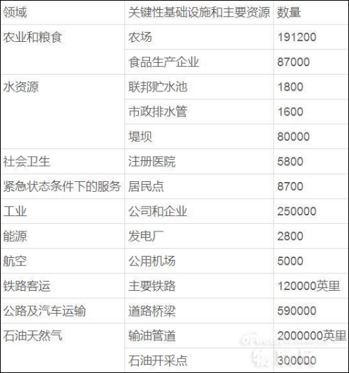 国外将关键性基础设施一般划分为:保障政府、国防、卫生、财政信贷、银行和科研领域以及工业、能源领域正常开展活动的设施;包括核电站、石油天然气设施在内的保障工业和能源部门正常运行的设施;粮食供应和交通保障设施;包括供水、通讯、民防设施在内的市政公用设施等。表1中介绍了在美国受到保护的关键性基础设施和主要资源的数量特征。