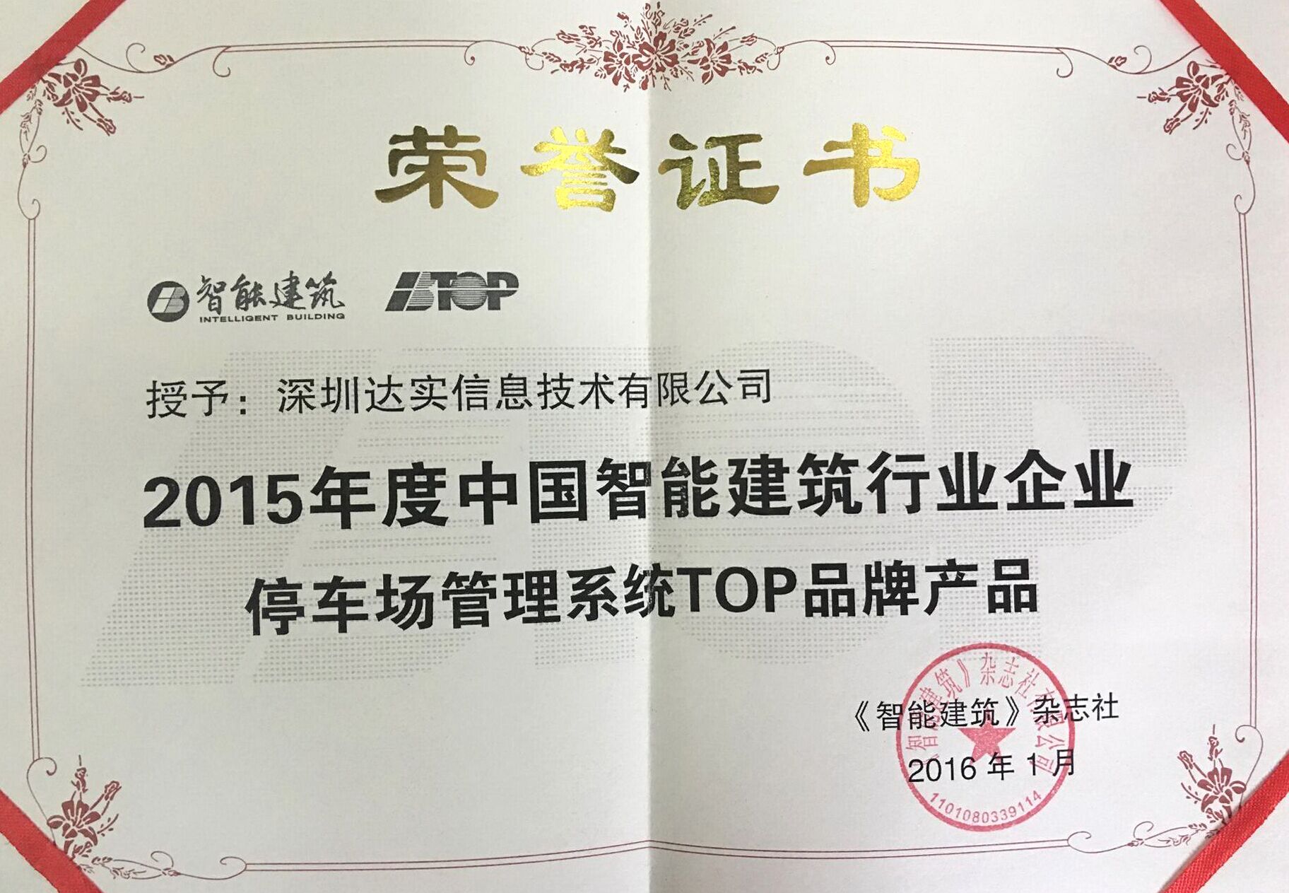 2015年度中国智能建筑行业品牌企业停车场管理系统证书