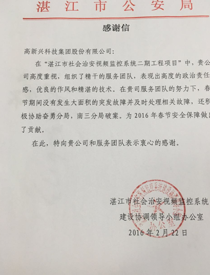 除了广州的越秀、花都、黄埔区以外,高新兴同样重视所属其它平安城市项目春运期间的情况。在广东揭阳、阳江、罗定;四川合江、贵州黔东,高新兴运维服务人员也全力配合当地的治安力量,为春运的治安监控排除故障、维护系统正常运行。并获得了各市的一致赞扬和感谢。湛江市公安局特别发出对高新兴集团的感谢信,信中写道:公司精干的服务团队表现出高度的政治责任感、优良的作风和精湛的技术。在服务团队的努力下,春节期间没有发生大面积突发故障,还积极协助破案,为2016春节安全保障做出了贡献。
