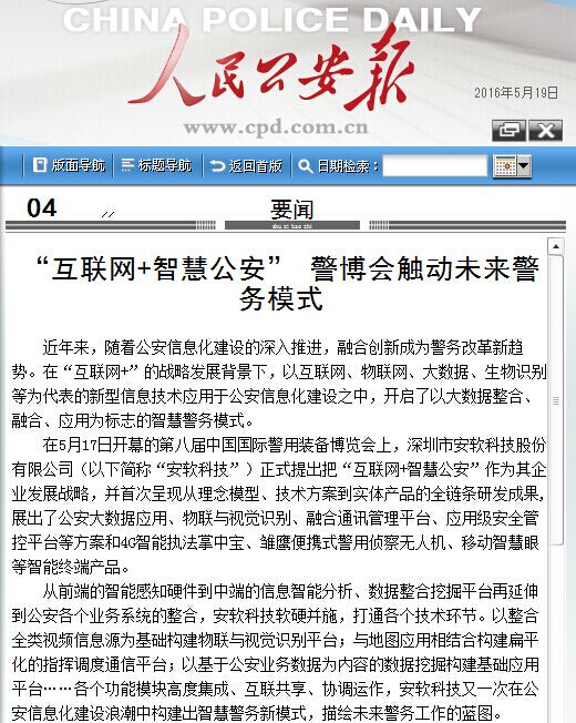 安软科技:人民公安报大幅报道“互联网+智慧公安”