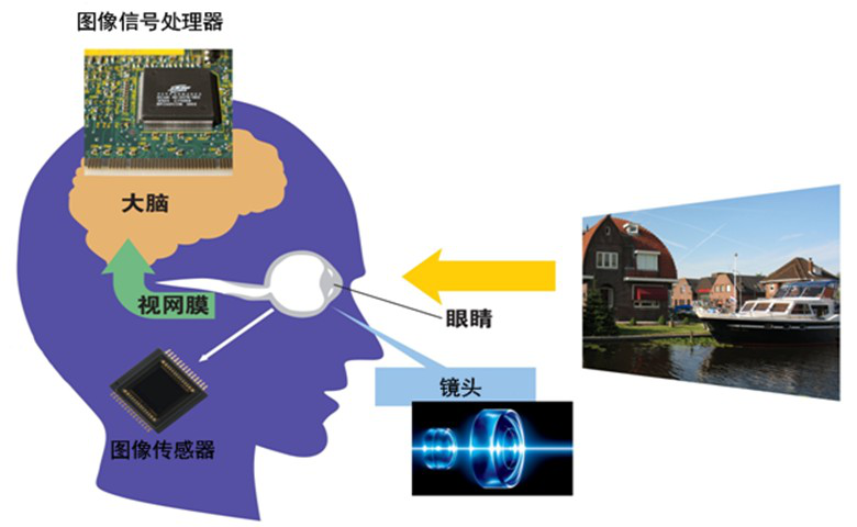 视网膜是人眼核心的功能,仿照这个功能,摄像机上有与之对应的传感器 (sensor),视网膜表面分布的光接收器产生图像视觉信号。