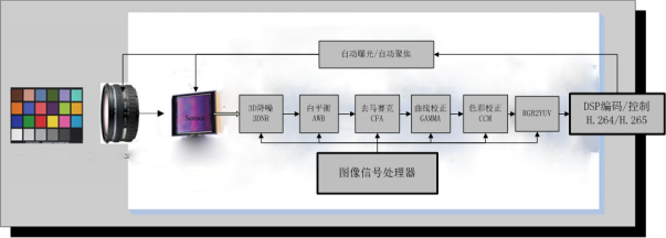 前面提到摄像机都是在模仿人眼的构造来成像,现在看一下摄像机的成像系统有哪些具体的构成。首先输入的图像会通过镜头传递到图像传感器上,图像传感器感知的数据会被后面接收,图像信号处理系统会对这些数据进行处理,通过一系列的算法,例如降噪、白平衡、CFA、曲线矫正、色彩矫正,从而形成人眼可以看到的正常图像。图像信号处理,也叫做ISP(Image Signal Process),其作用是模拟大脑对视网膜上的成像进行处理,产生视觉感知的图像。