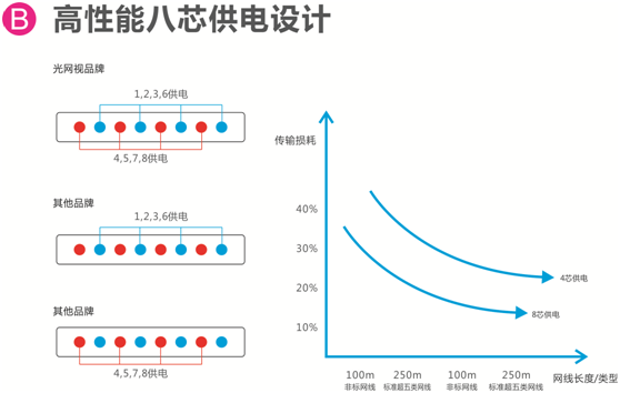 2、八芯线智能PoE供电技术:打破传统PoE四芯线供电限制,告别PoE供电线序选择历史,无缝对接PoE中间跨接法(4578)、末端跨接法(1236),八芯线供电降低阻抗,提升PoE传输质量,更节能,更便捷;