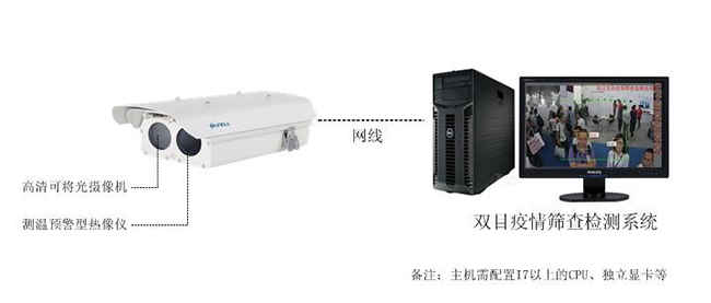 红外热成像非接触人体测温通过测温型热成像与可见光智能人脸识别算法技术相结合,被检测者在离检测设备5~8米处接受体温检测,不易引起被检测者的反感和恐慌,检测人员可在远程快速进行人体测温筛查,确定超温人群,从而实现潜在疫情人员的隔离。