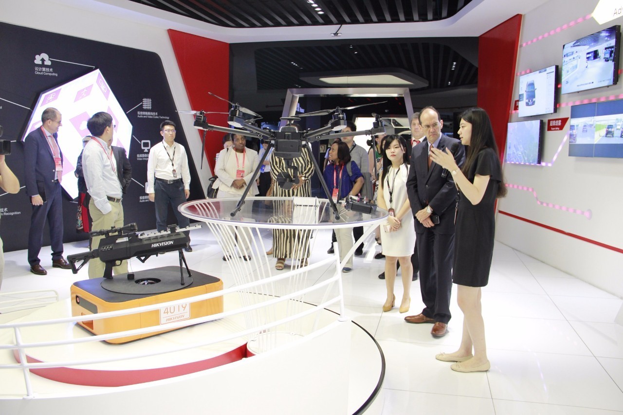 在海康威视智慧安防体验馆,会议代表们体验了AI摄像机的人脸识别比对、人体特征识别功能;了解了人、车、物、场景识别技术及视频数据结构化处理在提升视频大数据应用价值上的作用;并深入了解了海康威视在智能制造、智能物流中“AI+机器视觉+机器人”的创新应用。代表们对AI产品及解决方案在智慧城市、智能楼宇、智能交通、智能制造、智能物流等方面的应用产生了浓厚的兴趣,不断询问当前在海外的应用情况和相关技术细节,并认为这类技术和产品在物联网、可视化管理上具有重要价值,对社会、对世界意义重大。