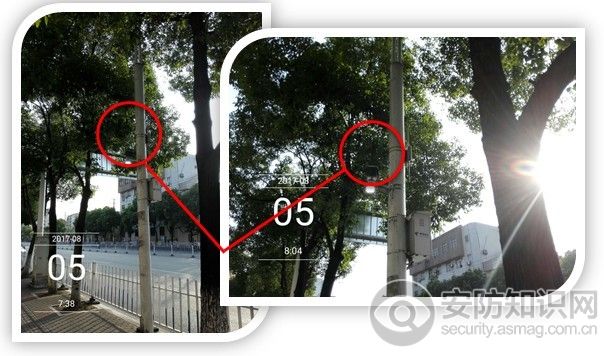同样一个地段,夏季某天早上7:38分和8:04分二次路过,如图2,摄像机补光灯常亮未熄。夜间路过此地段时,刺眼的补光灯灯光照射的行人不得不低头或者侧过身体,来躲避灯光。我在想犯罪分子路过此地段时,看着如此耀眼的灯光,会猜想到是监控摄像机补光灯的灯光,可能会选择绕行或者其它的方式来躲避监控,如此强烈的“光污染”早已失去安装监控摄像机的意义!