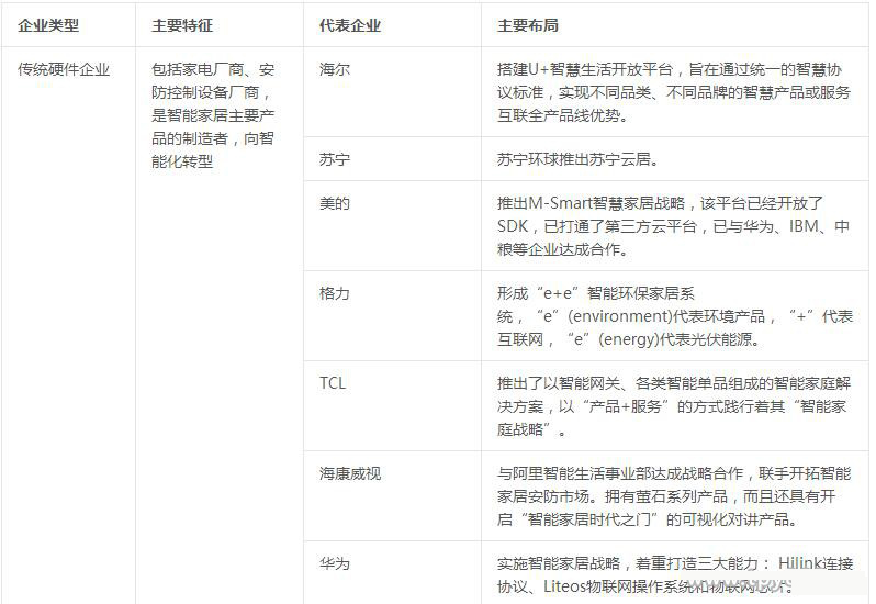 从企业层面来说,传统家电巨头海尔、美的、格力等,均积极布局,开发智能产品,同时寻求与互联网企业的跨界合作,从单体竞争逐渐转变为生态系统竞争。海尔与微软、魅族,美的与华为、小米、阿里等,均已达成战略合作,在资本、生态链、移动互联网等领域探索合作路径。同时,一些新兴创业公司兴起,多瞄准智能家电、智能插座、路由上网设备、照明系统、娱乐设备、健康健身设备、安防系统等单品进入市场,不过这些企业实力较弱,很多仅是昙花一现。
