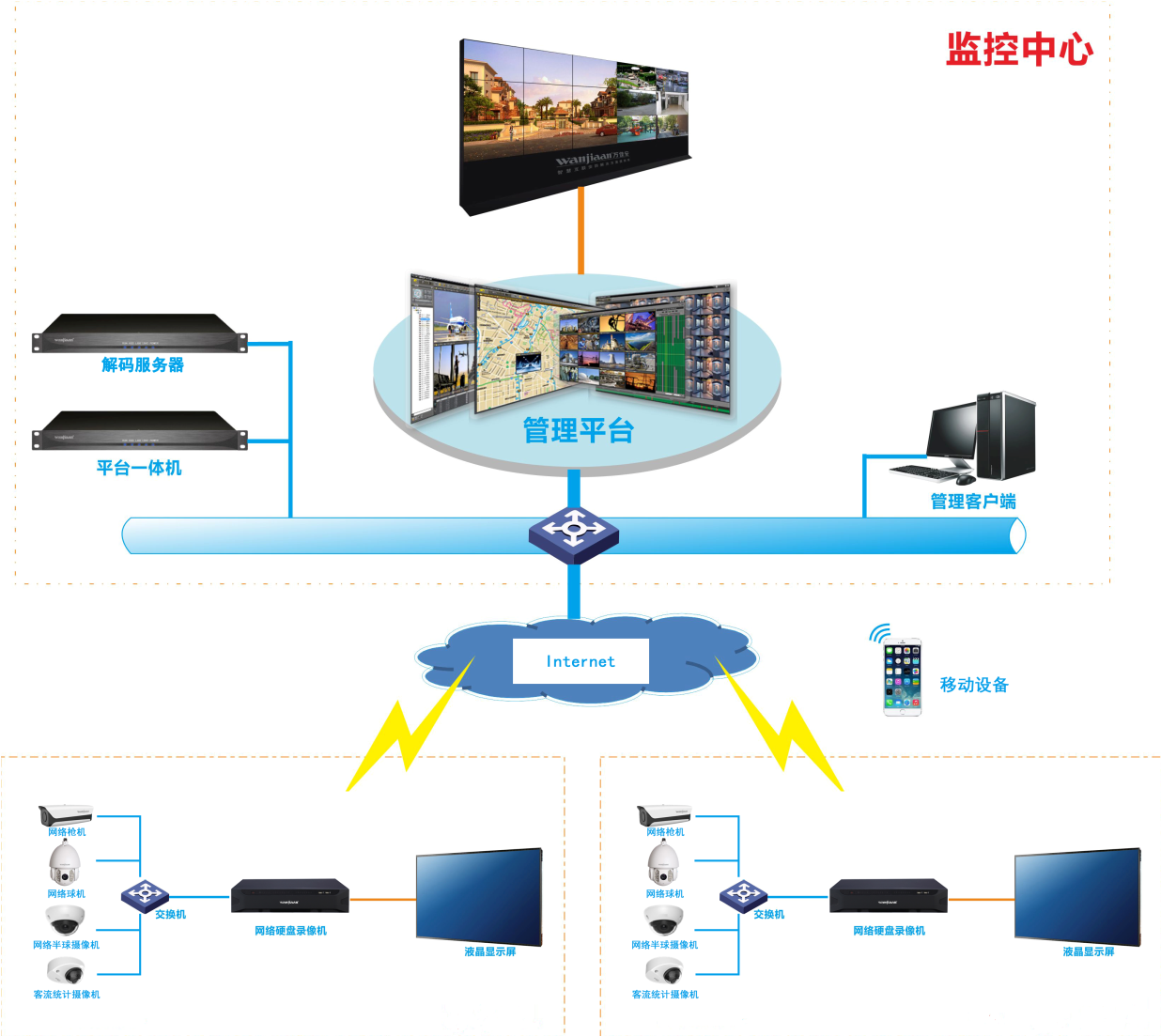 万佳安的视频监控系统建设方案采用纯数字化的系统架构,前端采用数字高清红外摄像机、数字高清云台摄像机(球机)、客流统计摄像机等作为视频采集设备,后端搭建高清网络视频监控平台,实现对前端进行统一的视频监控管理与调度、客流统计的智能分析、报警联动等功能,结合既有的人防和技防实现对各楼盘的高效管理。整套系统将选用我司的系列配套产品,充分利用现代网络技术,以最简单的方式提供高速图像传送,实现在调度中心内完成对各个售楼部的全方位实时监控、指挥调度,提高企业安全与安保工作效率。