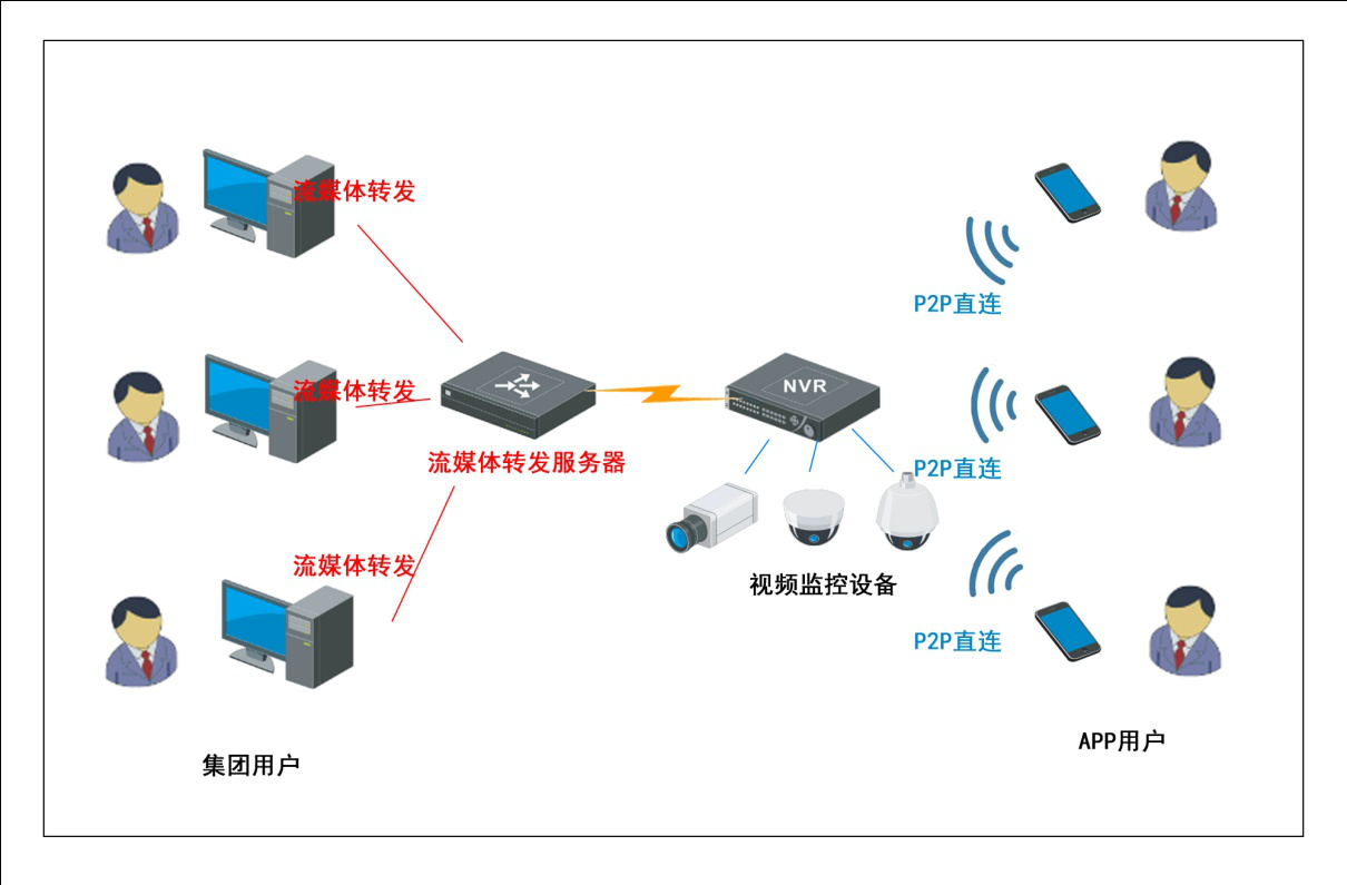 万佳安的视频监控系统的多地联网管理基于lnternet网络,为考虑到系统资源及网络带宽合理利用以及等因素,视频资源访问方式将采用P2P(点对点)与集中式转发两种方式相结合,其中集团总部用户访问视频资源将通过其流媒体转发服务器集中分发视频流,移动设备用户(如:手机APP)将采用P2P直连设备的方式访问视频资源,不通过集团中心转发,以减少集团中心的带宽压力,同时保障其视频观看流畅性。