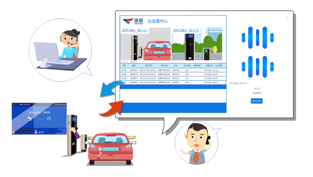 捷eⅡ型产品利用捷顺云坐席,可通过互联网集中管理车场岗亭。云坐席系统是捷顺近年来在无人值守业务模式上的新突破,物业与车场将岗亭工作委托给捷顺云坐席,云坐席将有专业人员24小时代为管理,单个云坐席岗位可实现对多个车场的管理,解决了在智能识别环境下人工开闸事件零散分布的服务痛点,可全面实现远程托管、远程监控、中心纠错、可视对讲,加上动态二维码缴费、当面付缴费、无牌车扫动态二维码出场等功能,深度打造无人值守业务场景闭环,为车场及物业公司有效节约成本,提高管理效率。